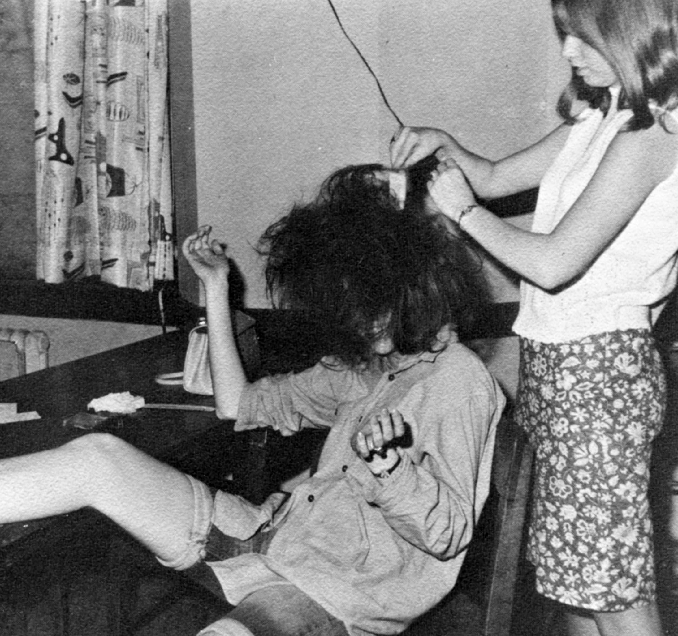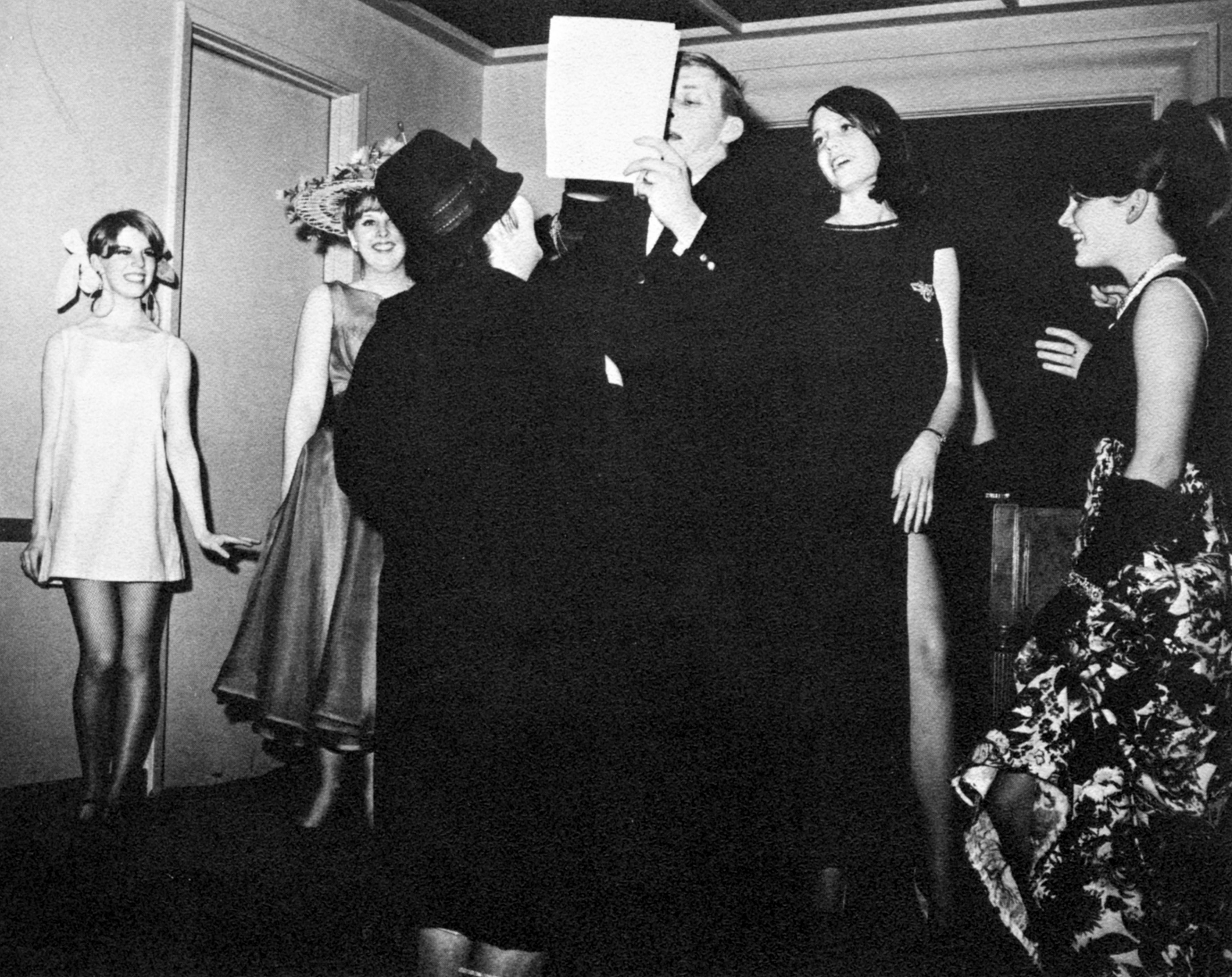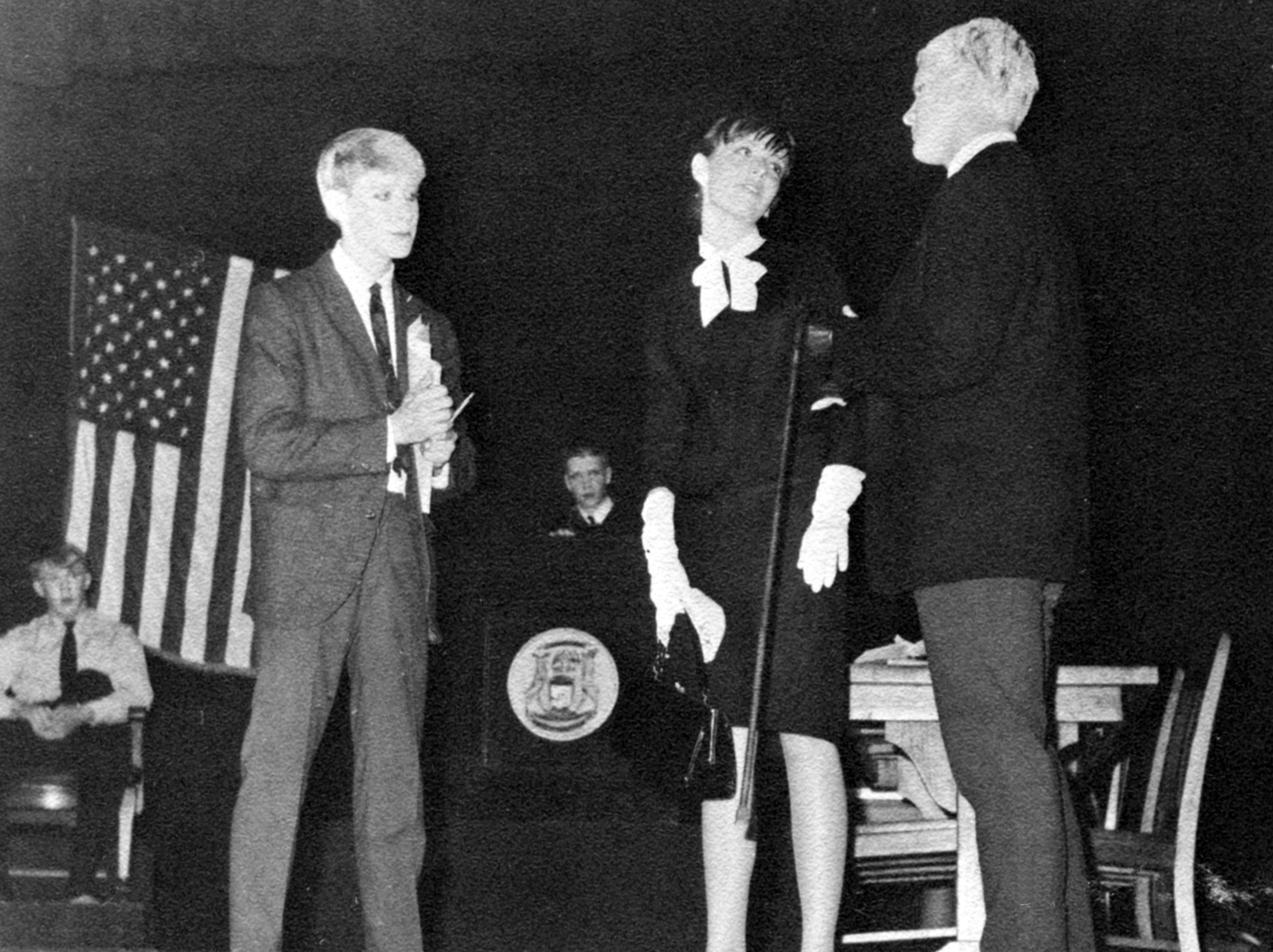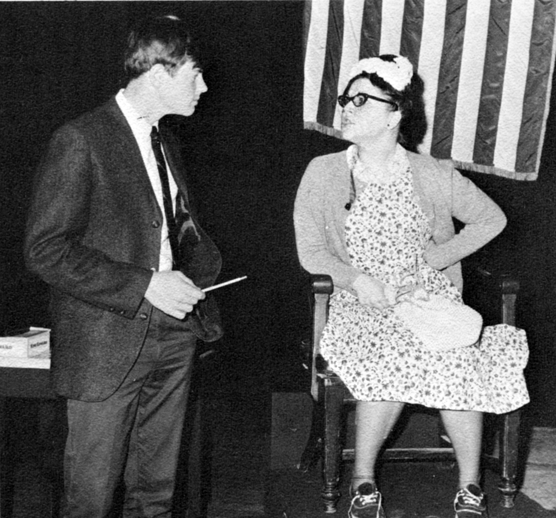 The next set of images were of the student plays in which we participated. Jerry Cooch was grilling Debbie Hille on the stand. Sharon Turner and other cast members argued the truth in front of Judge Hal Caswell in the production of "The Night of January 16th." In the dressing room, Karen Blakemore attended to a mop of hair beneath which the caption claimed was Sharon Turner. A bunch of classmates under the direction of Tom Dodd put on a faux Academy Awards ceremony.
