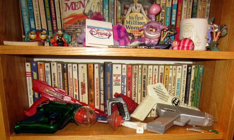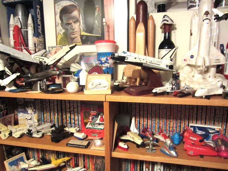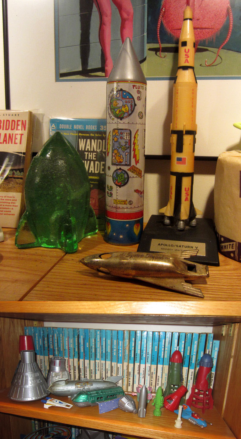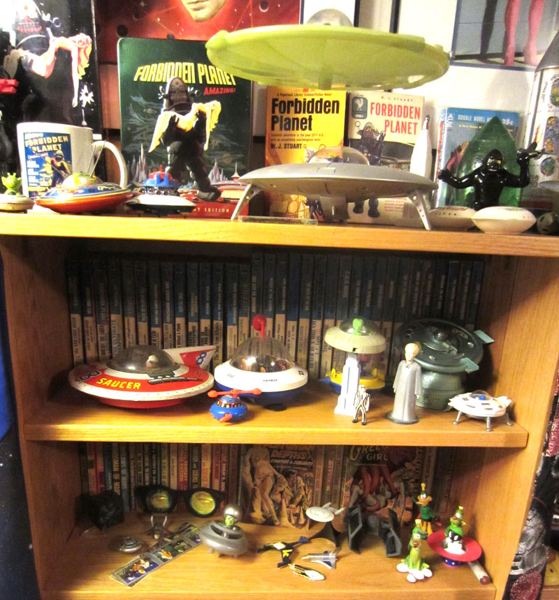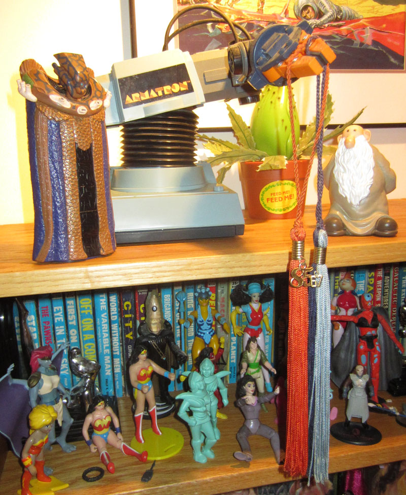 To help me return the room to man-cave status, Mary, the saint, did what she's done more than a few times over the past 20-odd years: she dusted every single one of the hundreds of tiny space-shuttles, flying saucers, aliens, super-heroes, Star Wars figurines, ray guns, sand worms of Arrakis, rocket ships, moon globes, robots, space brains, Godzillas, moon rocks, pieces of Kryptonite, and even the mechanical arm that grasps my two graduation tassels. What a trooper! By now she's touched my toys more times than I ever have. She's even learned which of the toys belong together. However, more than once during that week Mary said, "Don't you go and die and leave me with all this crap!"